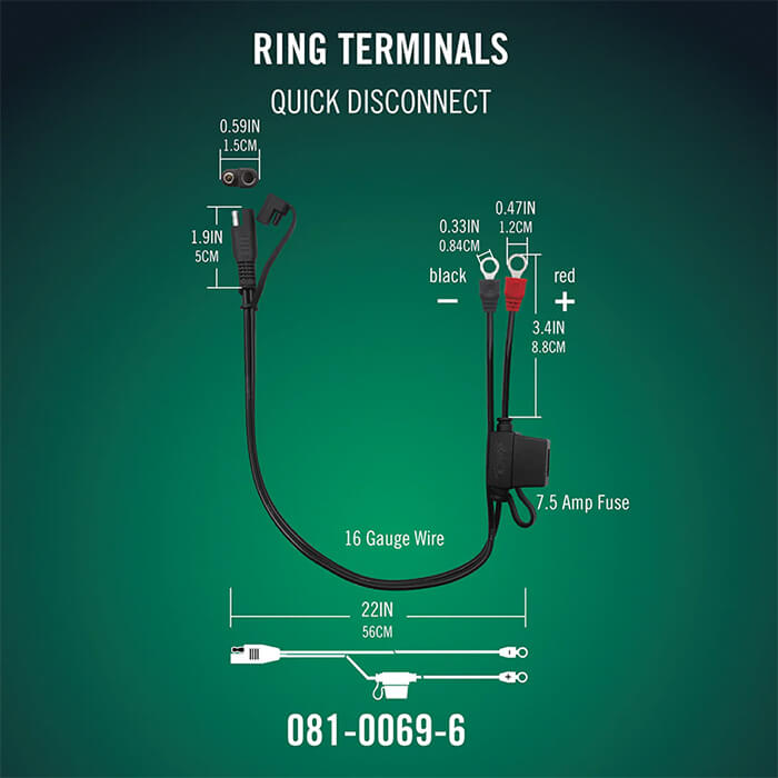 | Benefits | Enables hassle-free, repeated charging without reconnecting directly to terminals each time—install ring terminals once and use the quick disconnect for easy charger attachment. The fused design ensures safety, while the extension reduces terminal wear and simplifies maintenance for stored or frequently charged vehicles. Perfect for clean, professional installations in tight spaces or multi-vehicle setups. |