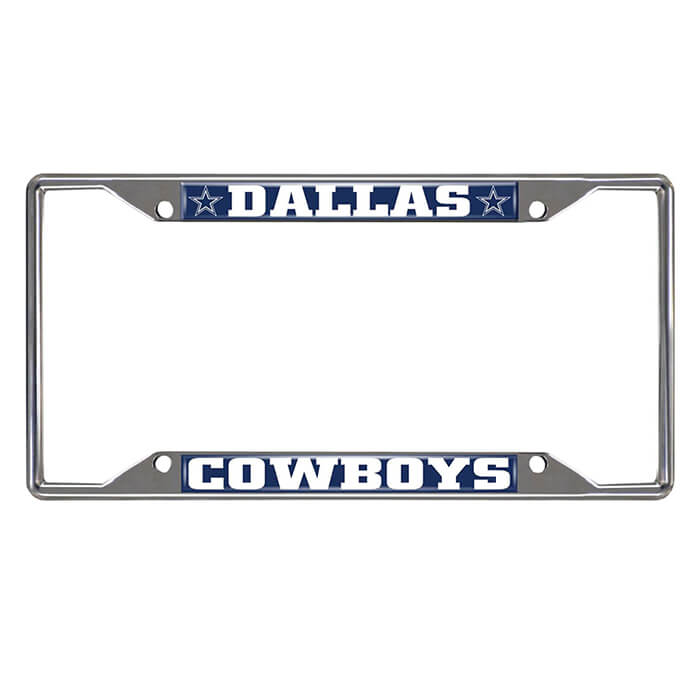 Description This officially licensed Dallas Cowboys Chrome Metal License Plate Frame is constructed from durable chrome metal with a finish that withstands the elements. Featuring bold team graphics and colors, it measures 12.25 inches by 6.25 inches and includes four pre-drilled holes for easy and secure installation on any vehicle. The slimline design ensures it fits perfectly around standard license plates without obscuring state names or registration stickers, making it an ideal way to display your team pride.