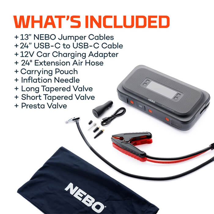 Included Jumper cables, USB-C charging cable, 12V car charger, 24″ air extension hose, nozzle kit