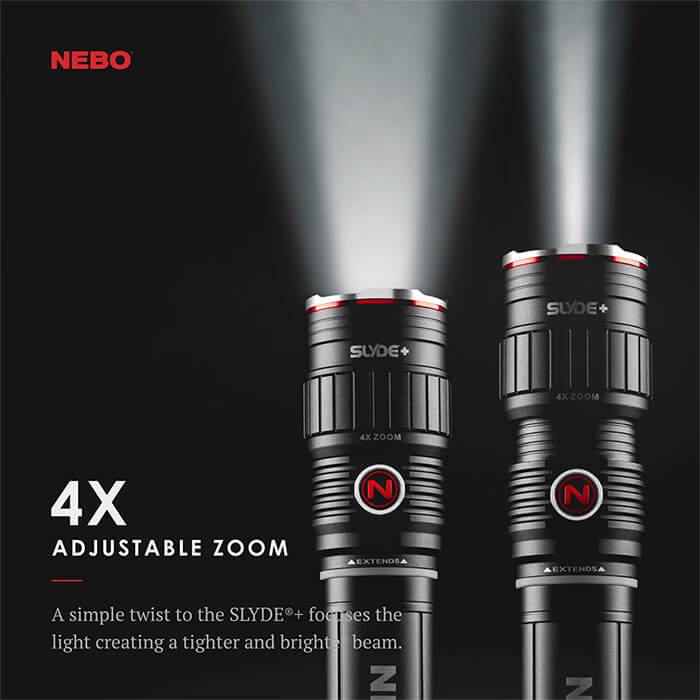 • 400 lumen LED flashlight with 4x adjustable zoom for precise long-distance spotting up to nearly 300 feet