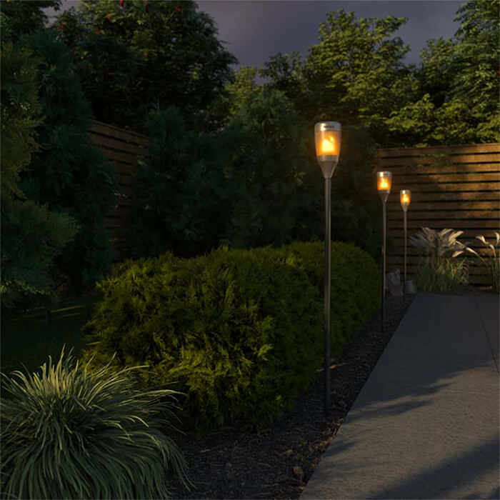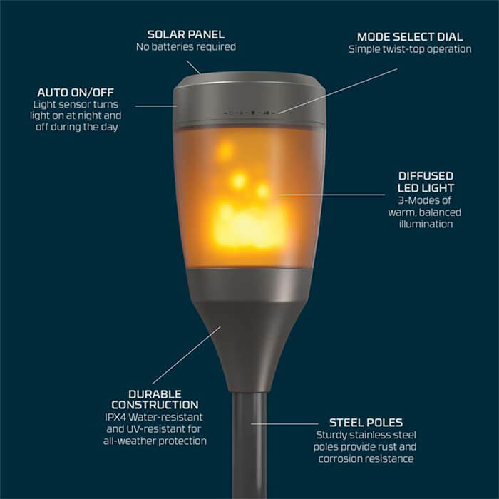 The NEBO Solar Torch with Steel Pole brings the warm, inviting glow of a classic torch to your outdoor spaces without any open flame. This solar-powered, rechargeable landscape light features a realistic flickering flame effect and warm diffused glow, making it perfect for garden beds, pathways, patios, camping areas, and backyard ambiance while delivering safe, maintenance-free lighting.