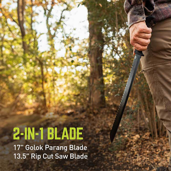 Forged from durable 3Cr13 steel with a black oxide coating for enhanced corrosion resistance and longevity, this full-tang machete features a robust 17-inch Golok Parang blade on one side and a 13.5-inch rip cut saw blade on the back, delivering 2-in-1 versatility that handles everything from dense vegetation to precise sawing. The ergonomic rubberized handle, crafted from a TPR and PP blend, ensures a secure, non-slip grip even in wet conditions, while the integrated lanyard loop adds convenience for easy carrying or storage.