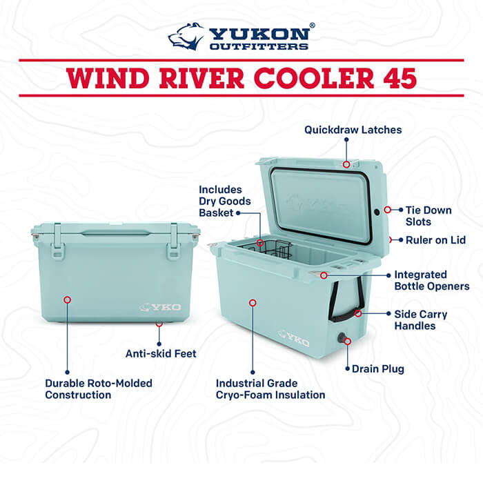 Discover the Yukon Outfitters 45qt Wind River YKO Rotomolded Hard Cooler in Cactus (YHC4522) – your essential outdoor gear companion for gameday tailgating, rugged camping trips, and lively backyard barbecues, built to keep your drinkware products refreshingly cold and ready for any escapade! This top-tier roto-molded hard cooler showcases seamless shell construction with comprehensive 360-degree CryoFoam insulation, offering outstanding up to 7 days of ice retention in its generous 45-quart capacity, ideal for chilling beverages, perishables, and snacks during extended outings.